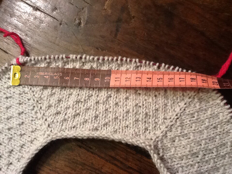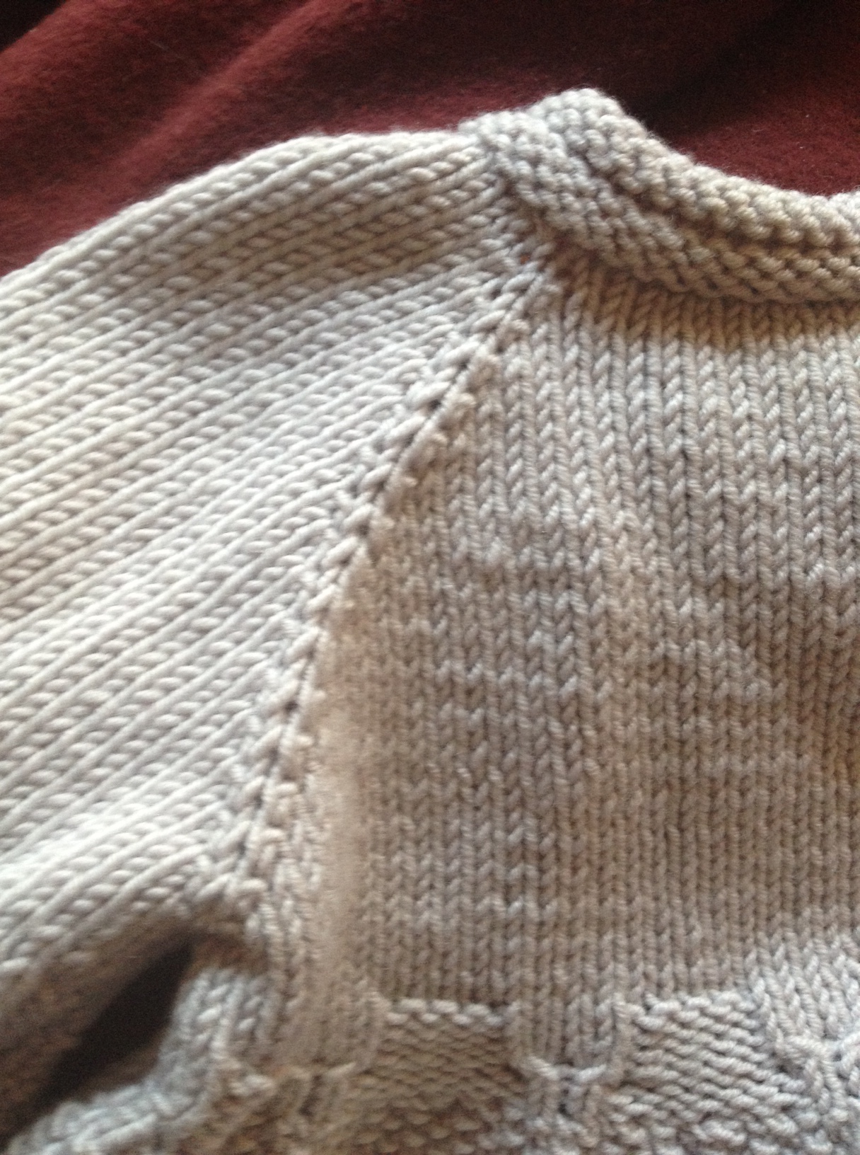 Continuo così, lavorando a m rasata e p seme, facendo 8 aumenti a ferro, a tutti i ferri diritti, per circa 10 cm, misurati sulla linea del raglan.