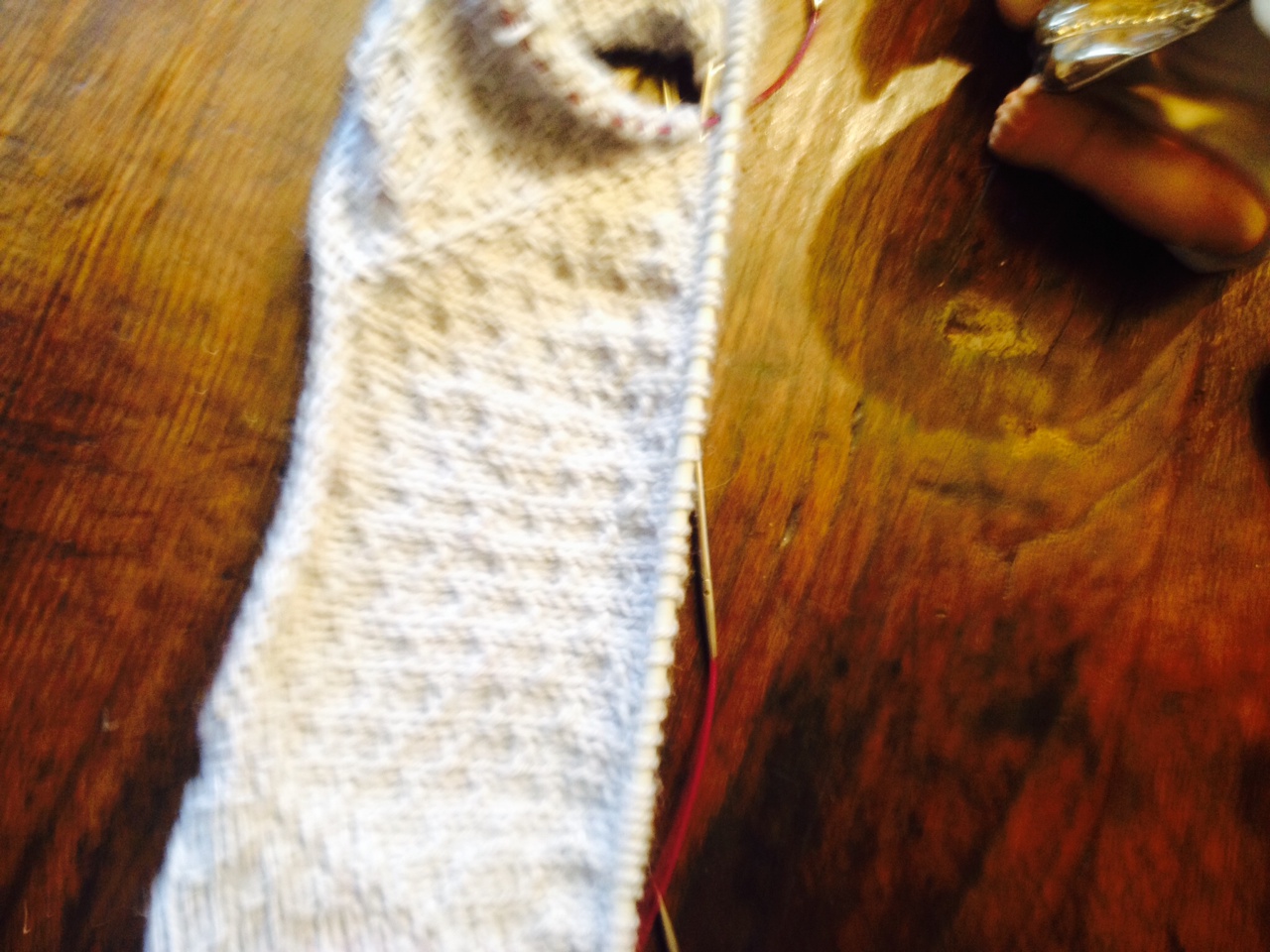 per cui, al rovescio del lavoro, lavoriamo le m fino al primo segno,(quelle di un davanti), eliminiamo il segno,trasferiamo su una spilla (io uso un ferro circolare) le m fino al secondo segno(e sono le m di una manica),eliminiamo anche questo segno,(e abbiamo lavorato il dietro) e trasferiamo in attesa le m successive, fino all’ultimo segno(e sono quelle della seconda manica), terminiamo il ferro.(e abbiamo lavorato anche il secondo davanti).