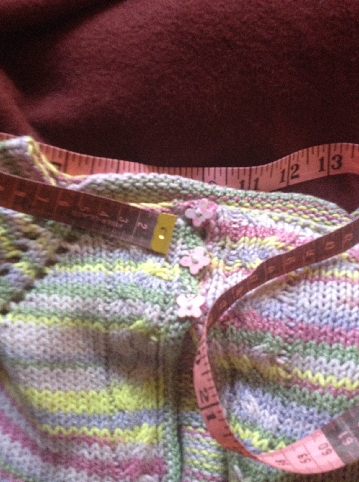 Quindi per prima cosa dovremo sapere quante m montare per il collo; per cui,prendete un cardigan che già avete, e di cui vi piace lo scollo, e misuratelo, ma senza ibordi.(in quello che faremo assieme il di m da montare ve lo dirò io, questa è solo la ricetta-base per fare un topdown)