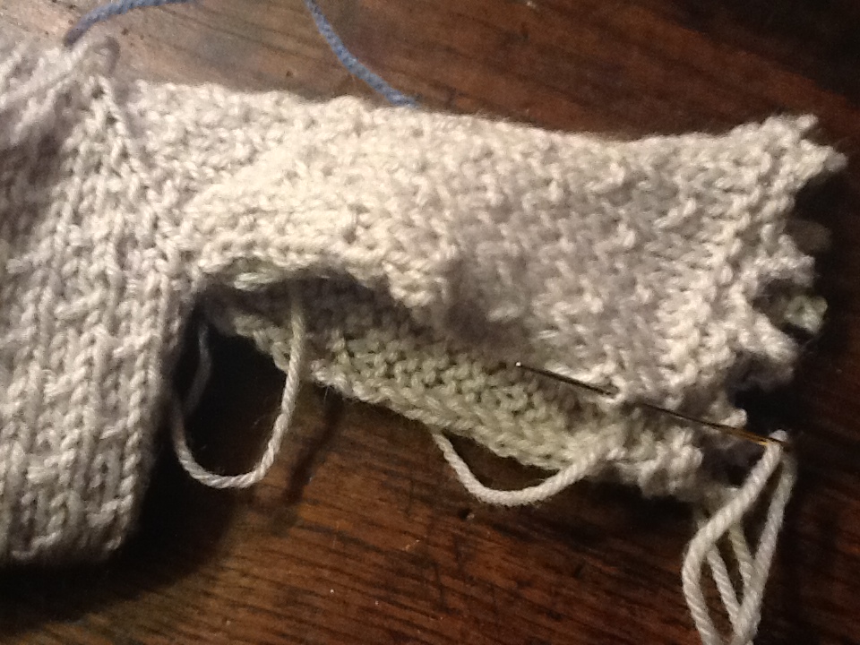 Montate sui ferri e con la lana che avete deciso di usare, una trentina di m, e lavoratele per un po’ con IL PUNTO CHE USERETE PER LAVORARE IL BORDO DEL COLLO, questo è importante, perchè se farete il bordo a legaccio risulterà più stretto di uno a m rasata.