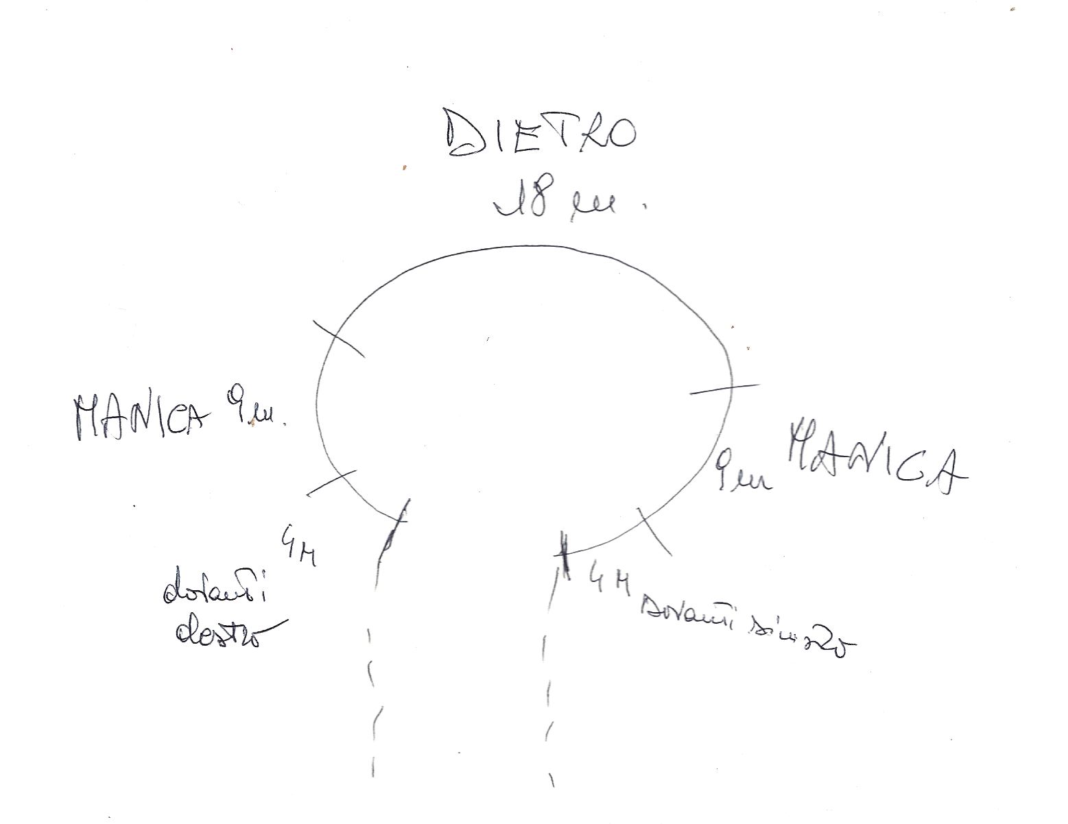 faccio un disegno decidendo il n di m per ogni parte, per poter poi mettere un segno tra le parti,che mi aiuterá a capire dove fare l’aumento per i raglan: