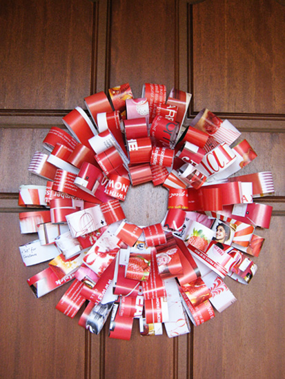 qui le istruzioni per realizzare la corona di carta:http://childhood101.com/2011/12/homemade-christmas-decorations-magazine-wreath/