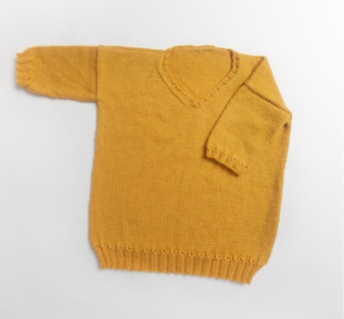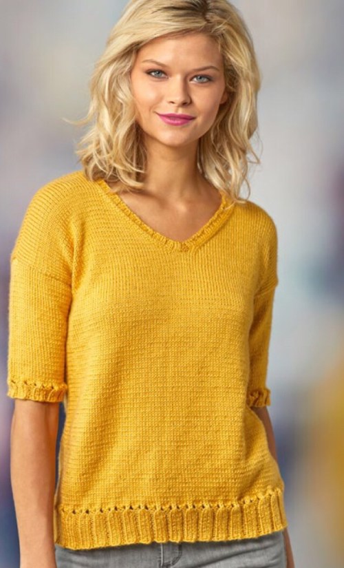 Lav 47 dir(52, 57, 63, 68, 73, 78), m, metterle in attesa per la spalla sinistra, lav al dir la m succ e metterla su una spilla,( m centrale dello scollo a V) , lav dir fino alla fine —47 (52, 57, 63, 68, 73,78) m.