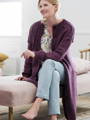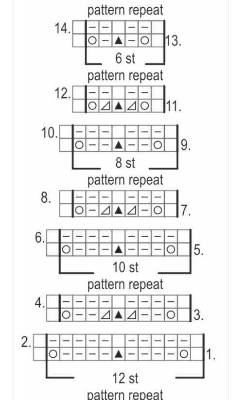 Continuare ripetendo i 10 ferri del motivo– 32 (36, 40, 44) m aumentate , 81 (91, 101, 111) m. Chiudere le maglie sul diritto del lavoro.