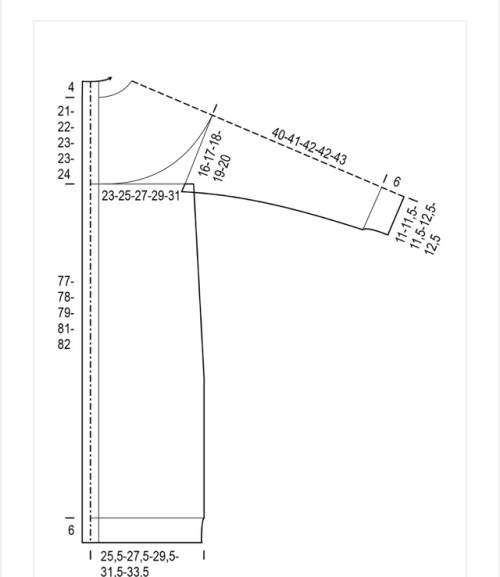 Con i ferri più grandi, al diritto del lavoro, iniziando alla base dello scalfo dietro destro, riprendere e lavorare al dritto 16 (18, 20, 22) mlungo lo scalfo dietro destro , 1 m dalla spalla e 16 (18, 20, 22) m dallo scalfo davanti destro – 33 (37, 41, 45) m.