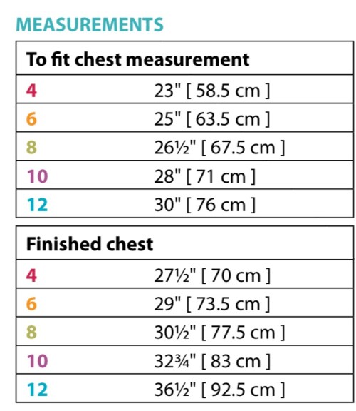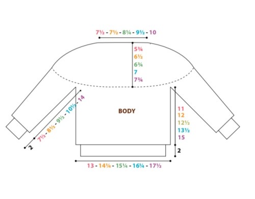 Per una taglia inferiore (12 mesi) mantenete lo stesso n di m per lo scollo ma aumentate ai raglan fino ad ottenere 24/5 cm di larghezza del bust