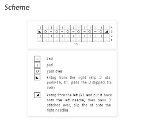 g 4: *Passare una maglia a rovescio, due diritti, accavallare la maglia passata sui due diritti,3 rov *ripetere fino alla fine