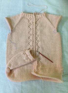 Con i ferri 3,5 e iniziando dal centro del sotto manica, riprendere e lavorare al dritto 6 (6, 6, 6, 6, 9) m, rimettere sui ferri le 66 (70, 74, 78, 82, 80) m in attesa , lav dir fino alla fine e riprendere altre 6 (6, 6, 6, 6, 9) m e mettere un s d’inizio giro( BOR )